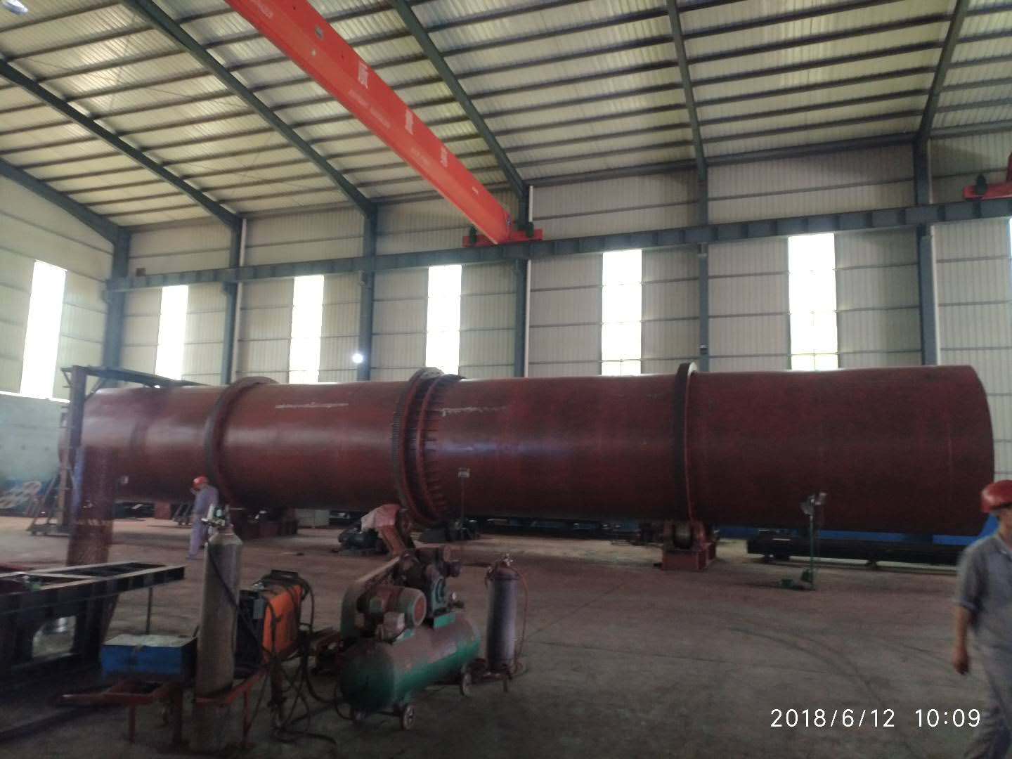 干燥的濕物料由皮帶輸送機(jī)或斗式提升機(jī)送到料斗,然后經(jīng)料斗的加料機(jī)通過(guò)加料管道進(jìn)入加料端。加料管道的斜度要大于物料的自然傾角,以便物料順利流入干燥器內(nèi)。干燥器圓筒是一個(gè)與水平線略成傾斜的旋轉(zhuǎn)圓筒。物料從較高一端加入,載熱體由低端進(jìn)入,與物料成逆流接觸,也有載熱體和物料一起并流進(jìn)入筒體的。隨著圓筒的轉(zhuǎn)動(dòng)物料受重力作用運(yùn)行到較底的一端。濕物料在筒體內(nèi)向前移動(dòng)過(guò)程中,直接或間接得到了載熱體的給熱,使?jié)裎锪系靡愿稍?,然后在出料端?jīng)皮帶機(jī)或螺旋輸送機(jī)送出。在筒體內(nèi)壁上裝有抄板,它的作用是把物料抄起來(lái)又撒下,使物料與氣流的接觸表面變大,以提升干燥速率并加速物料前進(jìn)。載熱體一般分為熱空氣、煙道氣等。載熱體經(jīng)干燥器以后,一般需要旋風(fēng)除塵器將氣體內(nèi)所帶物料捕集下來(lái)。如需進(jìn)一步減少尾氣含塵量,還應(yīng)經(jīng)過(guò)袋式除塵器或濕法除塵器后再放排放。